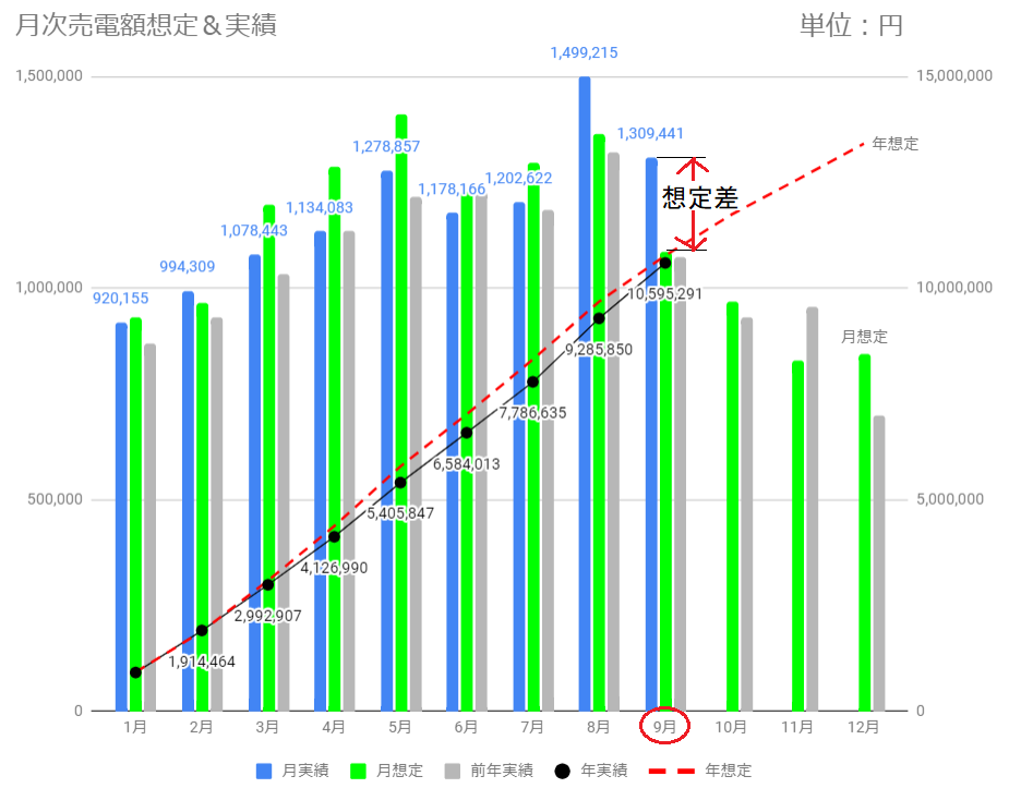 8月、9月と2ケ月連続して想定を超えましたが、1月~9月の合計はそれでも想定比マイナス(-17.2万円)です。