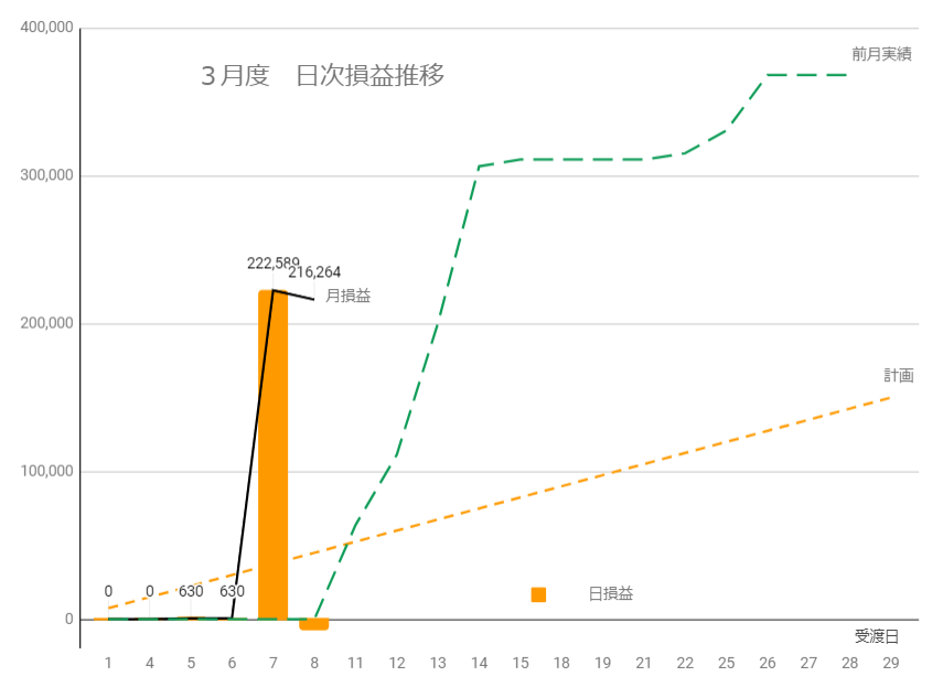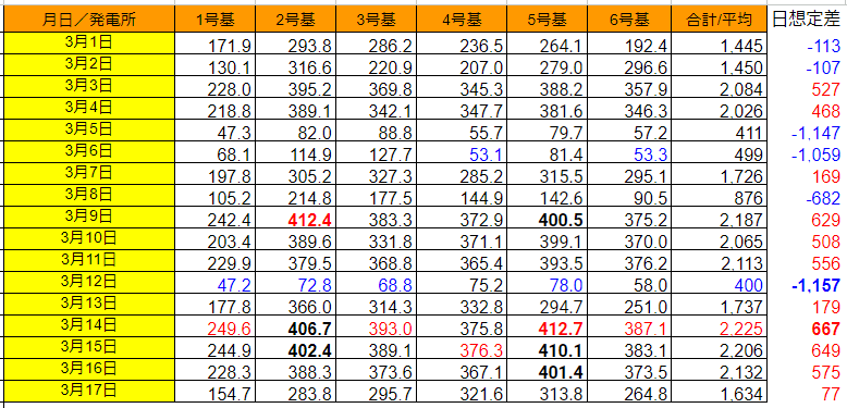 日別に見ると、3/14の2,225kWh(想定比+667kWh)が最大で、最小は3/12の400kWh(想定比 -1,167kWh)でした。