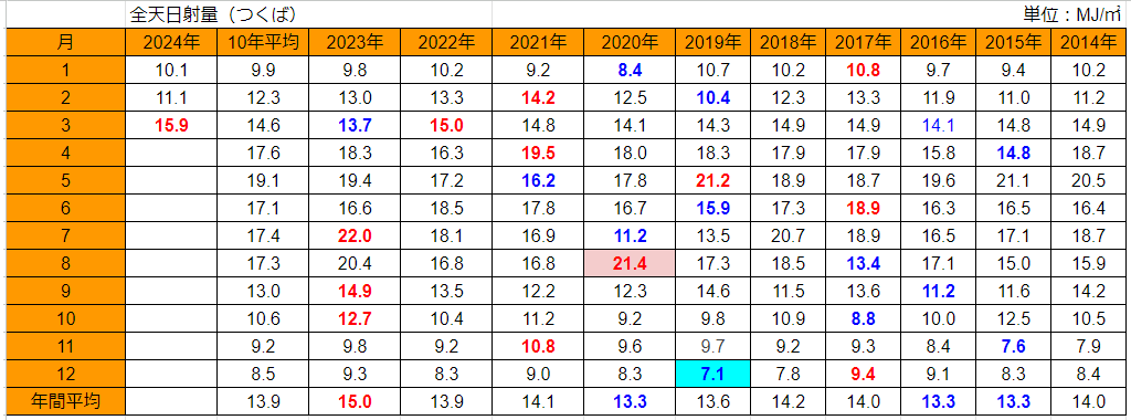 その前にMy発電所に近いつくばの日射量を確認します。