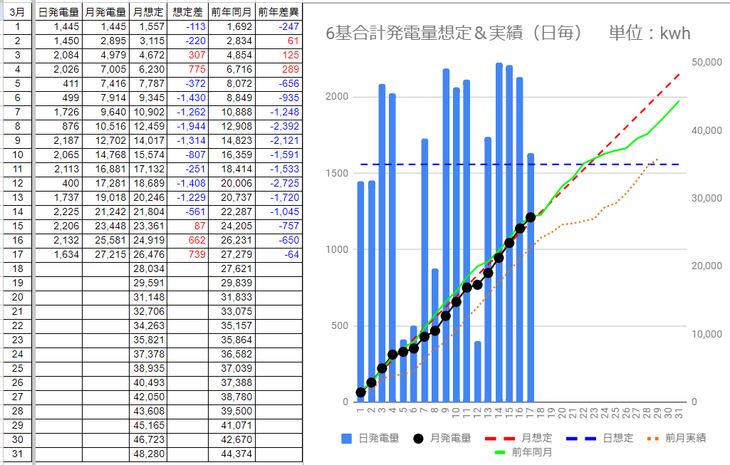 3/17迄の発電量は想定を 739kWh 上回りました。