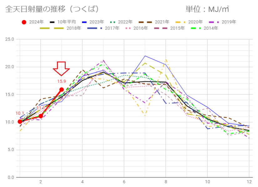 今月前半(3/16迄)の日射量は過去10年でベストの15.0MJ/㎡を上回る15.9MJ/㎡です。