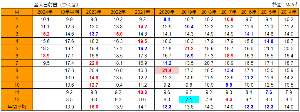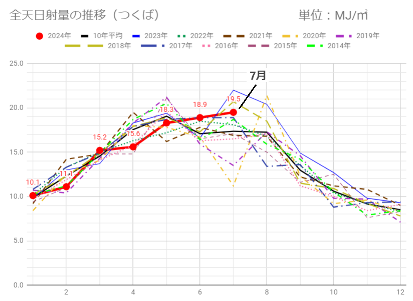 今月(7/30迄)の日射量は昨年7月の22.0MJ/㎡ には及びませんが、それでも過去10年では3番目の19.5MJ/㎡でした。