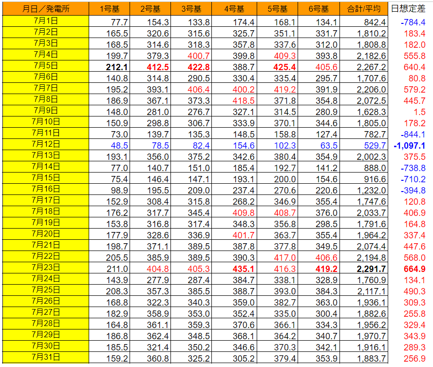日別に見ると、7/23の2,291.7kWh(想定比+664.9kWh)が最大で、