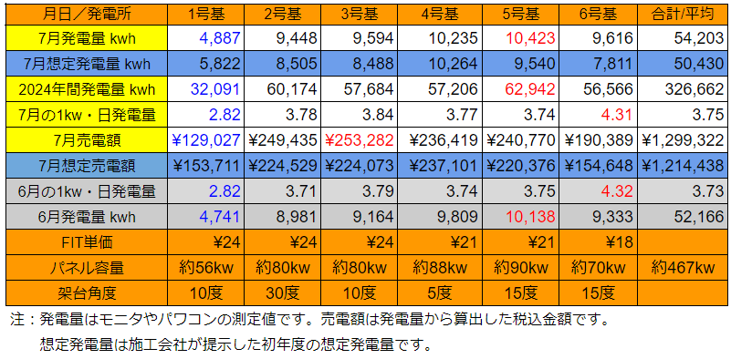 7月前半の発電量は想定を若干下回りましたが、梅雨明け後は連日猛暑が続いていますので今月後半の発電量は伸びたかと思います。