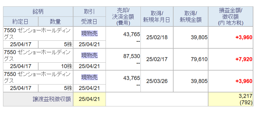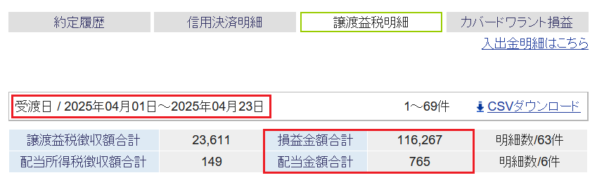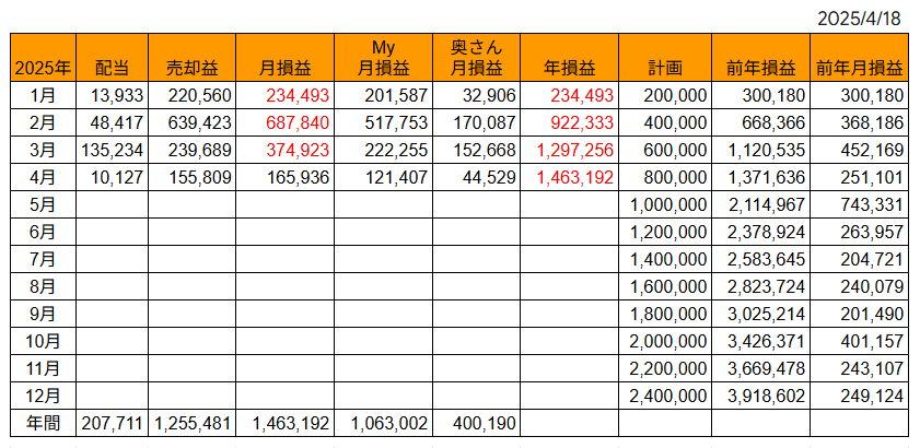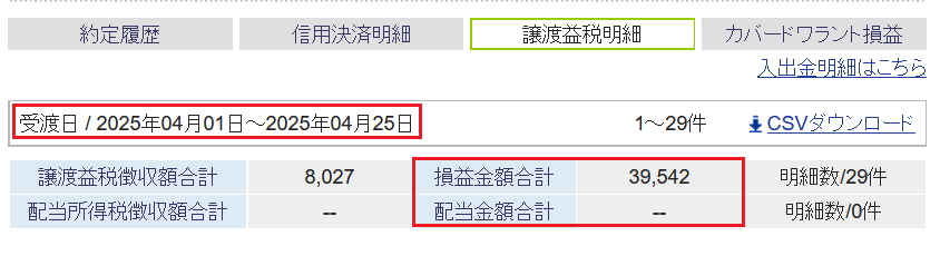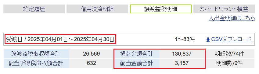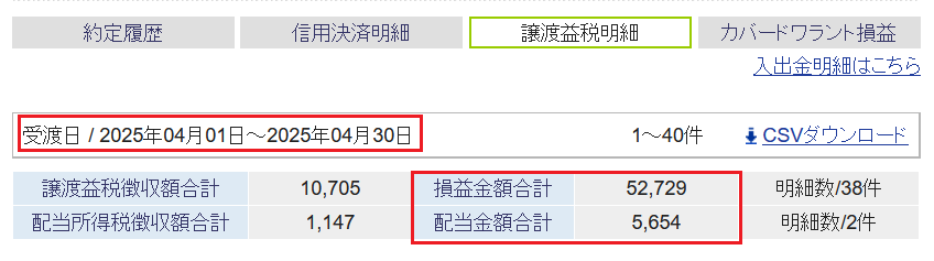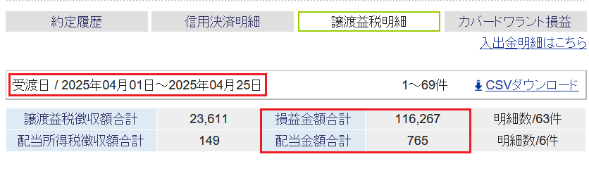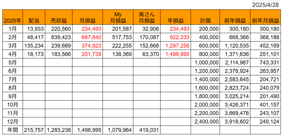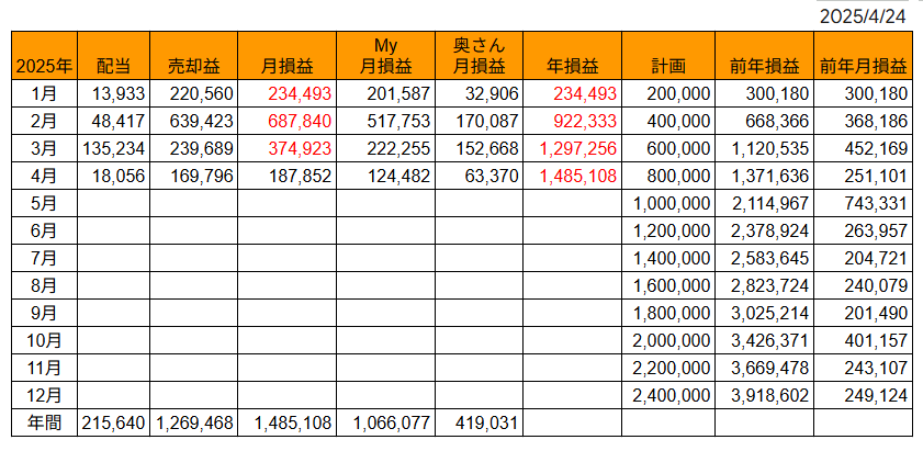 奥さんは4/25の株取引はなく、今月の特定口座の確定損益は+58,383円↓で
