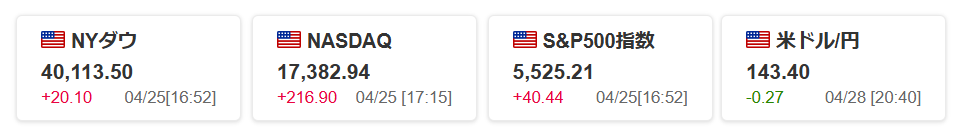 4/25 Fri. の米国株は3指数ともに上昇、ドル/円も143円程度で推移していることもあり