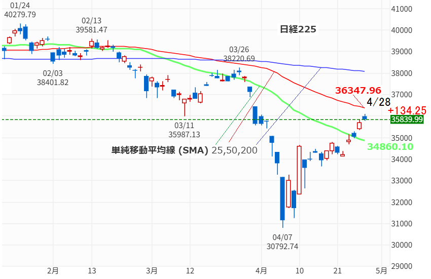 今日4/28の日経平均は一時36,000円を超えました。その後は上値が重くやや値を下げたものの4日続伸 134.25円高 の 35,839.99円 で引けました。