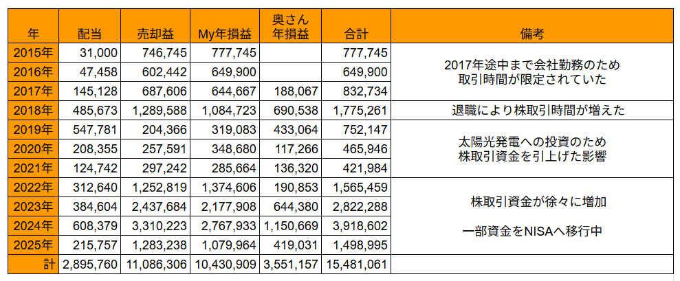 記録を付けている2015年以降の株取引確定損益(税引前)です。