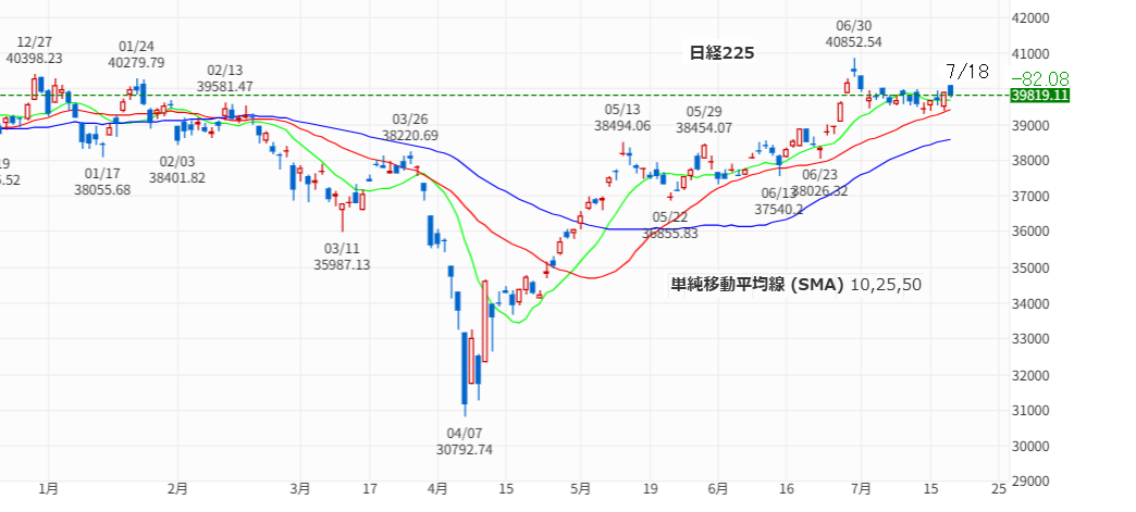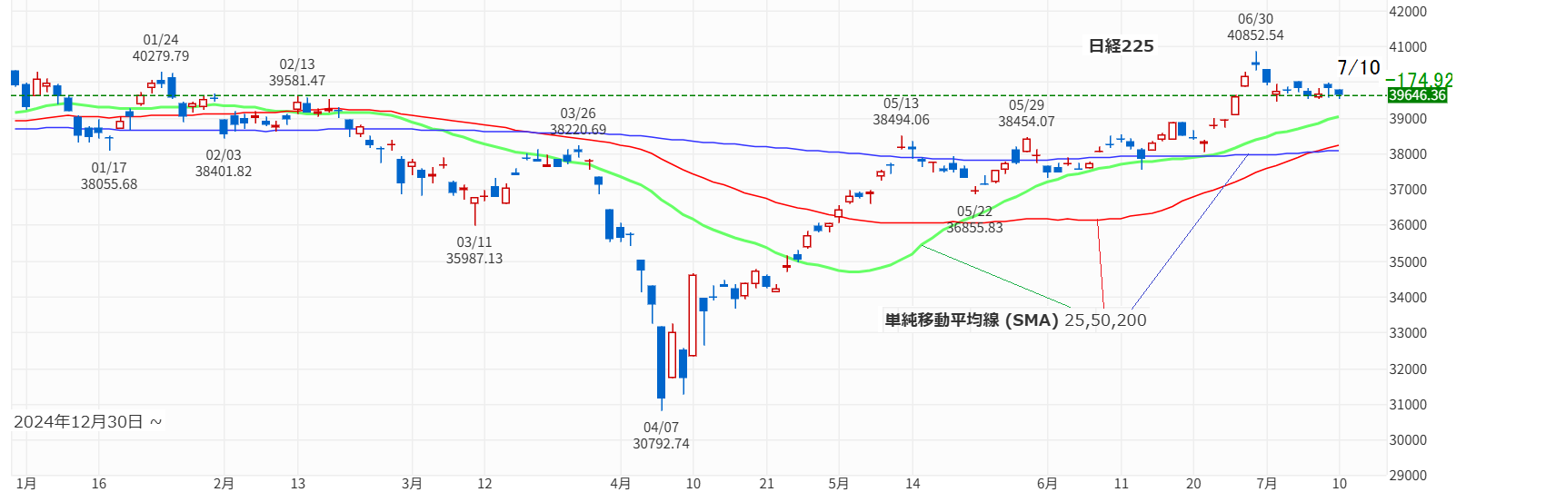 日経平均は今日も寄り付きから下落し結局 323.72円安 の 40,674.55円で引けました。