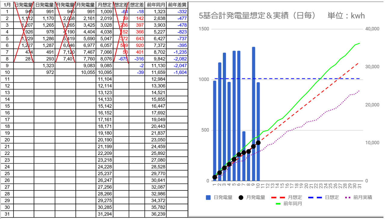 1/9の5基合計の発電量は1,323kWh(日想定差+314kWh)、1/10は972kWh(日想定差-37kWh)でした。パネル1kwあたり1日の発電量は2.34 2.46から2.55kWhにアップしました。