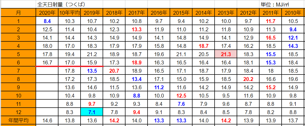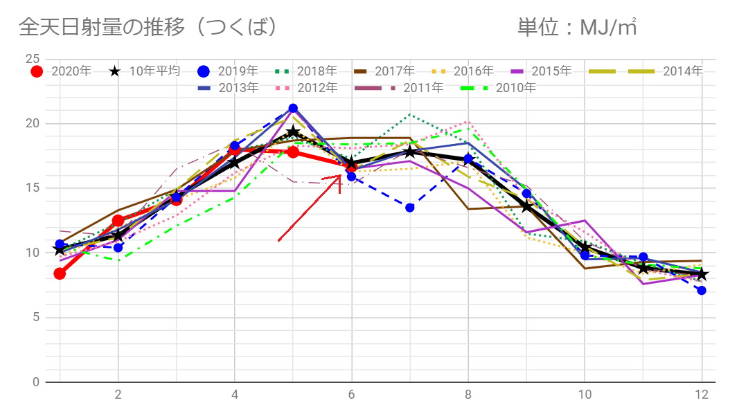 つくばの6月の日射量は16.7MJ/㎡で昨年6月の15.9MJ/㎡より多いものの過去10年平均の17.0MJ/㎡よりは少ない値です。
