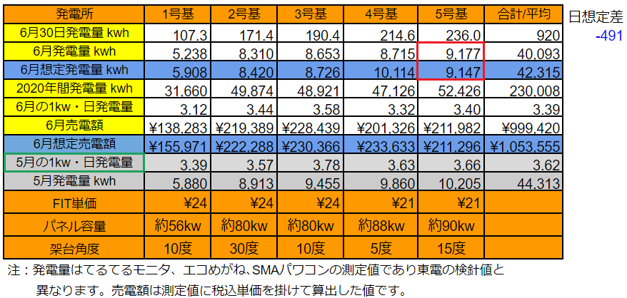 6/30の5基合計の発電量は920kWh(日想定差-491kWh)でした。