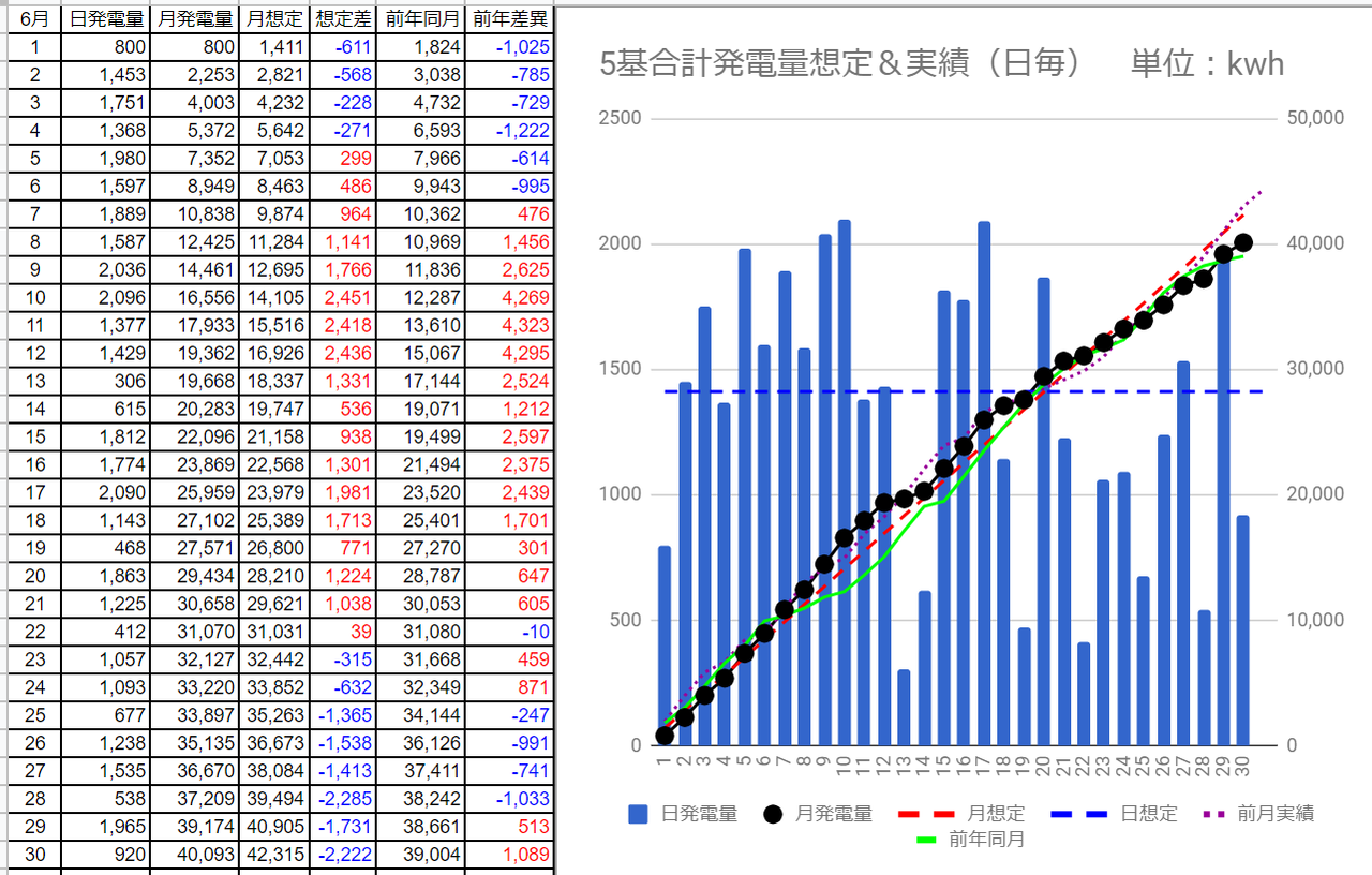 6月の発電量は40,093kWhで想定差は6/29の-1,731kWhから-2,222kWhへ拡大しました。(^_^;)