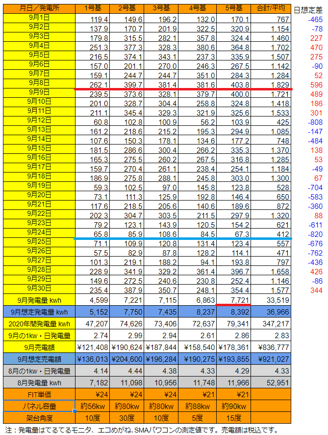 9/29の5基合計の発電量は1,146kWh(日想定差-86kWh)、9/30は1,577kWh(日想定差+344kWh)でした。