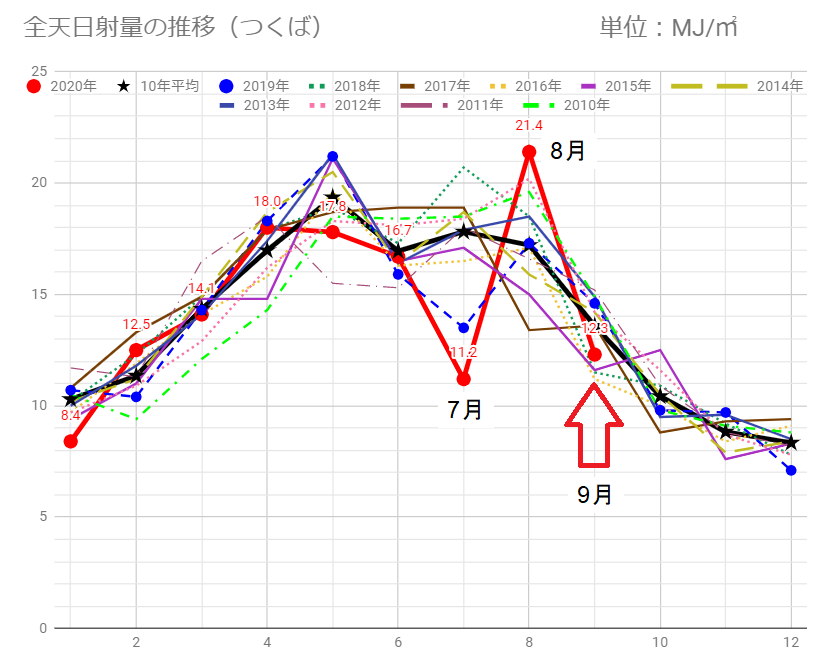 My発電所に近い つくば の8月の日射量は観測史上2位の21.4MJ/㎡を記録しましたが、そこから12.3MJ/㎡(-42.5%)に急降下しました。