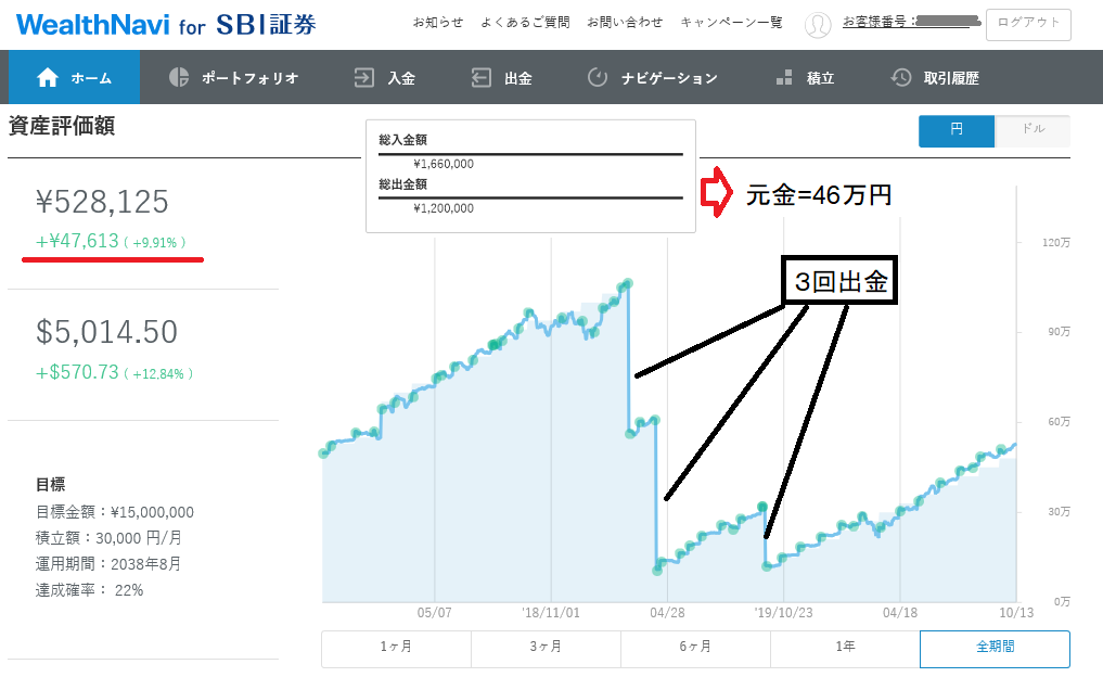 画面では評価損益は、+47,613円と表示されていますが、途中3回出金して元金は46万円ですので、配当を含む評価損益は、+68,125円です。