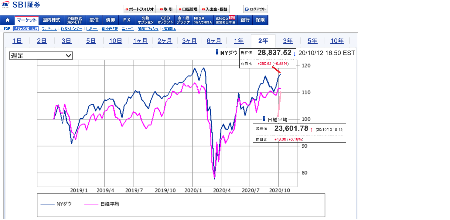 これはNYダウ、日経平均ともに新型コロナの影響による落ち込みから順調に回復しているためと思います。
