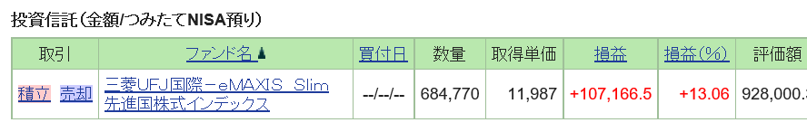 次は、eMAXIS Slim(先進国株式インデックス)です。こちらは奥さんのつみたてNISA口座で週7,600円積立です。