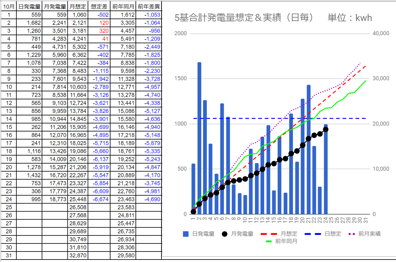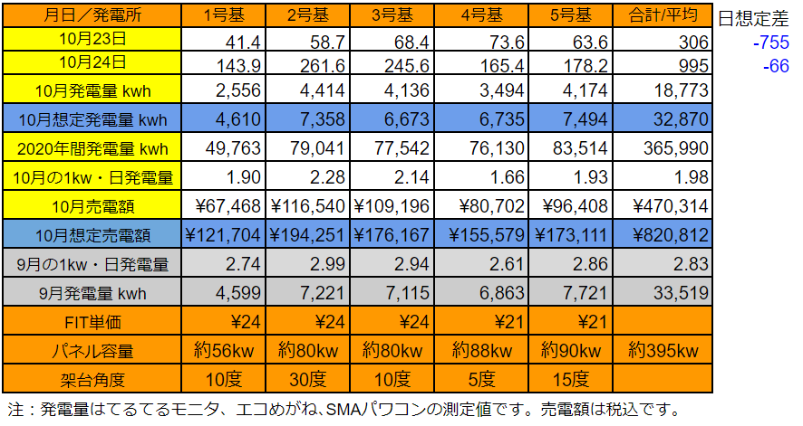 10/23の5基合計の発電量は僅か306kWh(日想定差-755kWh)、10/24は995kWh(日想定差-66kWh)でした。