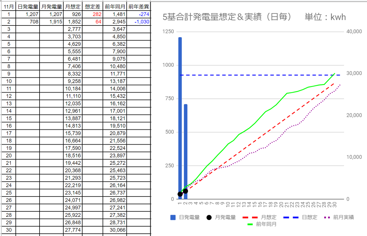 11/1の5基合計の発電量は1,207kWh(日想定差+444kWh)、11/2は708kWh(日想定差-218kWh)でした。