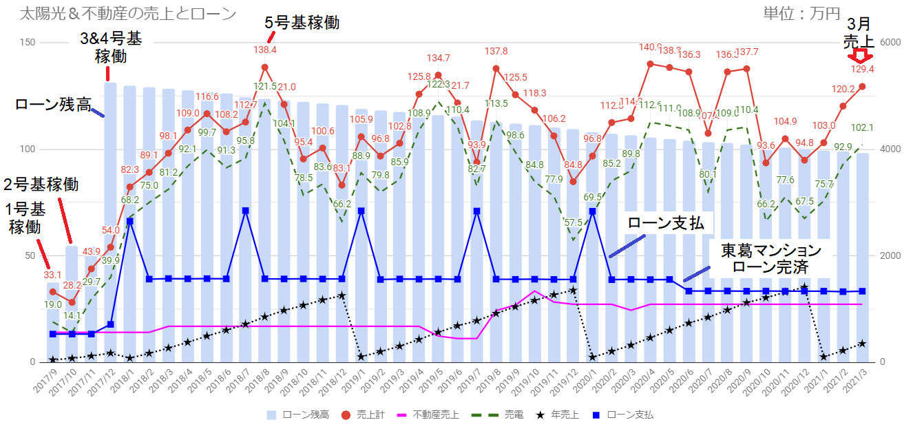 注:太陽光発電+不動産賃貸の売上を赤折線で表示しています(不動産売上は簡易的に不動産管理会社からの入金=売上としています)。売上の内訳として太陽光発電を緑破線、不動産賃貸は紫折線です。また、年売上は黒折線(点線)、ローン残高は薄水色(縦棒)で表示しています。月の売上とローン支払は左目盛り、年売上とローン残高は右目盛りです。