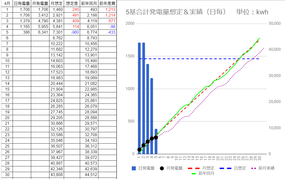 4/4の5基合計の発電量は1,165kWhで想定差は-295kWh、4/5は僅か386kWhで想定差は-1,074kWhでした。