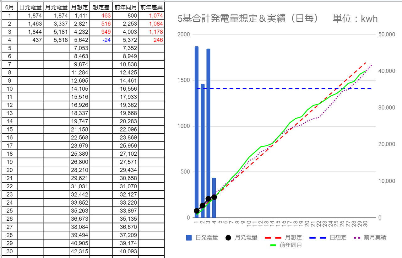 6/3の5基合計の発電量は1,844kWhで想定差は+434kWh、6/4は437kWhで想定差は-973kWhでした。