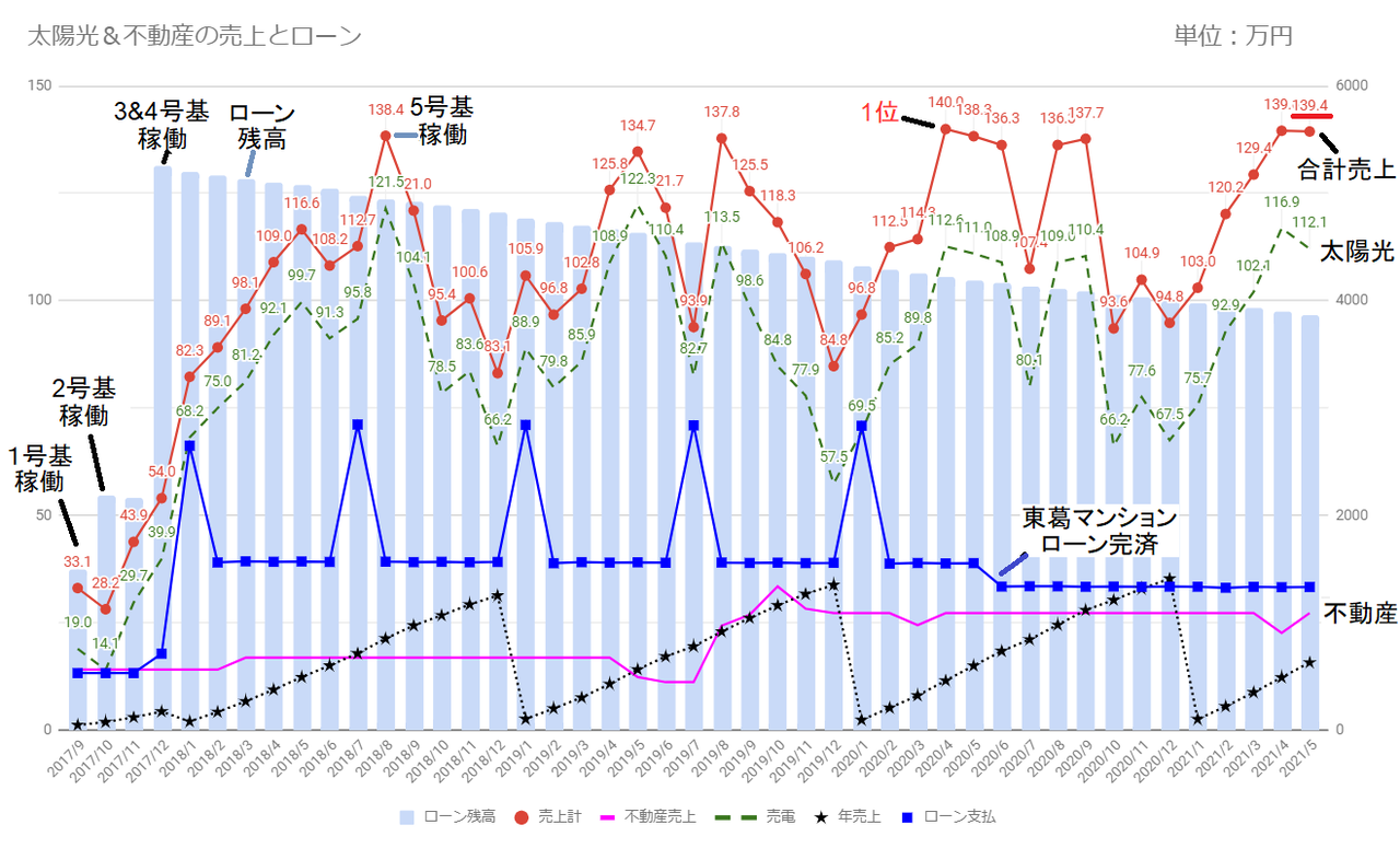 注:太陽光発電+不動産賃貸の売上を赤折線で表示しています(不動産売上は簡易的に不動産管理会社からの入金=売上としています)。売上の内訳として太陽光発電を緑破線、不動産賃貸は紫折線です。また、年売上は黒折線(点線)、ローン残高は薄水色(縦棒)で表示しています。月の売上とローン支払は左目盛り、年売上とローン残高は右目盛りです。