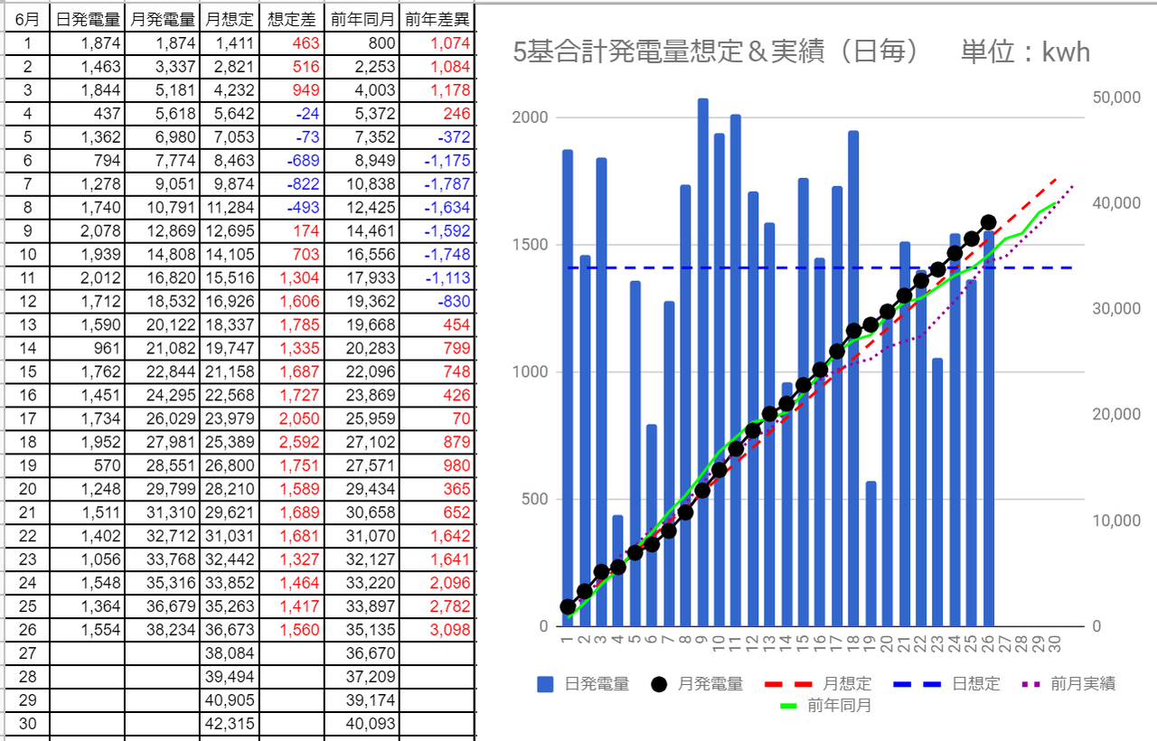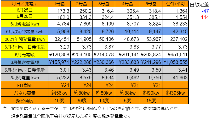 6/25の5基合計の発電量は1,364kWhで想定差は-47kWh、6/26は1,554kWhで想定差は+144kWhでした。
