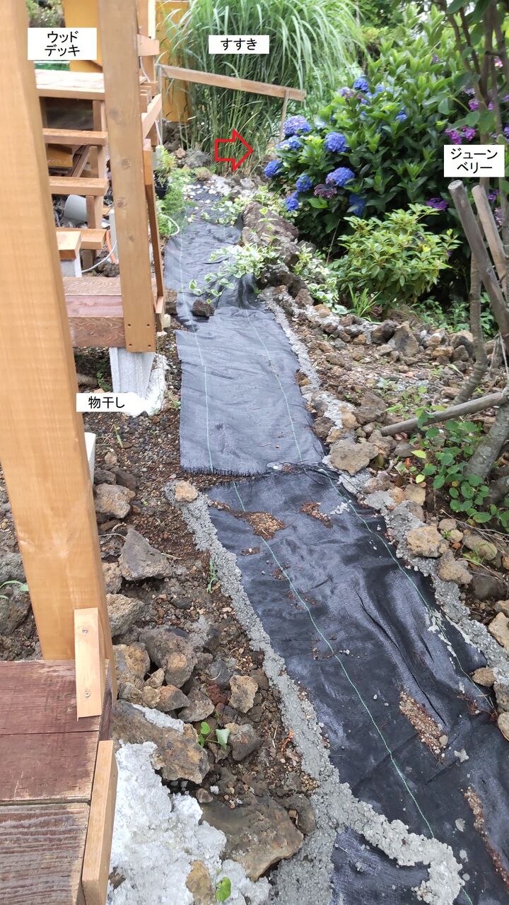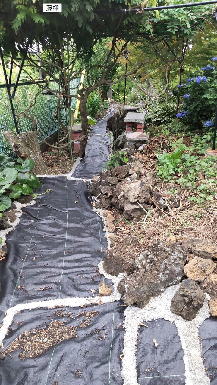 そこで庭の通路部分にも防草シートを敷き除草の手間を減らしたいと思い、今月初めから暇をみつけて作業を進めています。