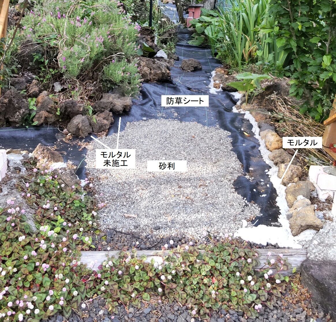 防草シートの上には砂利を敷き、シートの端は溶岩とモルタルで固定してみました。