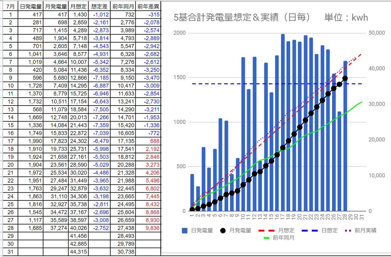 7/27の5基合計の発電量は1,117kWhで想定差は-313kWh、7/28は1,685kWhで想定差は+256kWhでした。