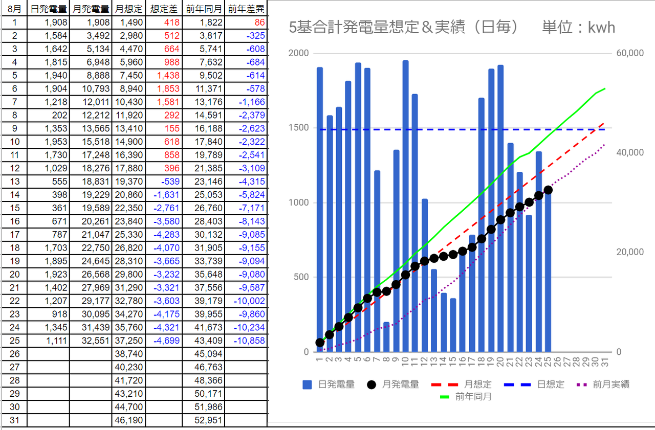 8/24の5基合計の発電量は 1,345kWh で想定差は-145kWh、8/25は 1,111kWh で想定差は-379kWhでした。