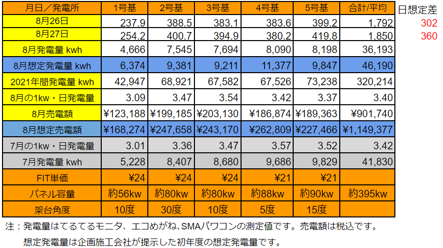 それでは、8/26~27の発電量です(各発電所の仕様はこちらです)。