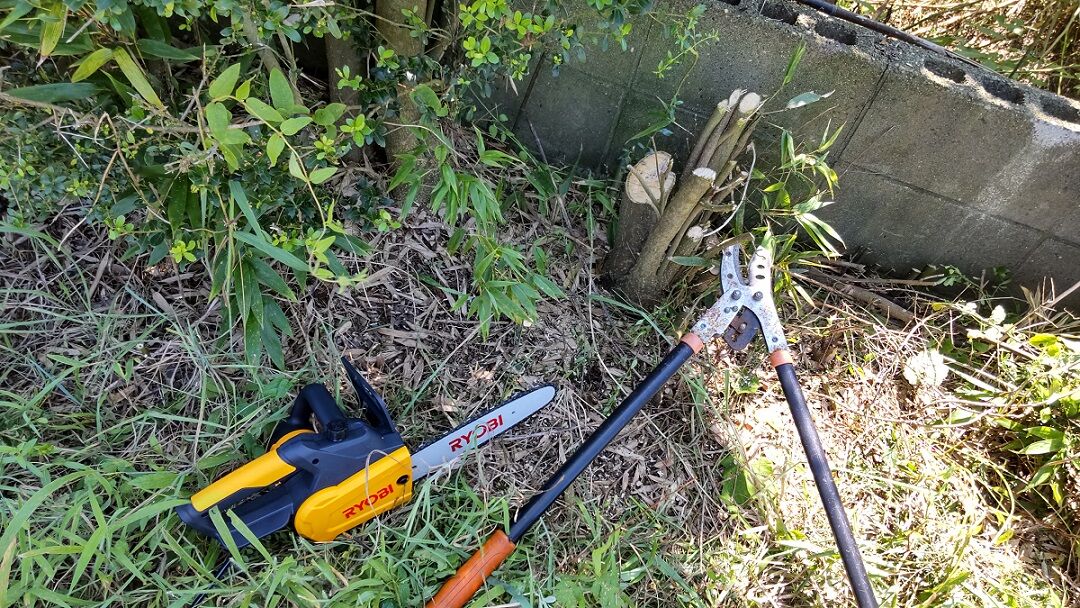 枝切り鋏で細い枝(~3㎝程度)を切り、それより太い幹は先日購入した電動チェーンソーを使います。