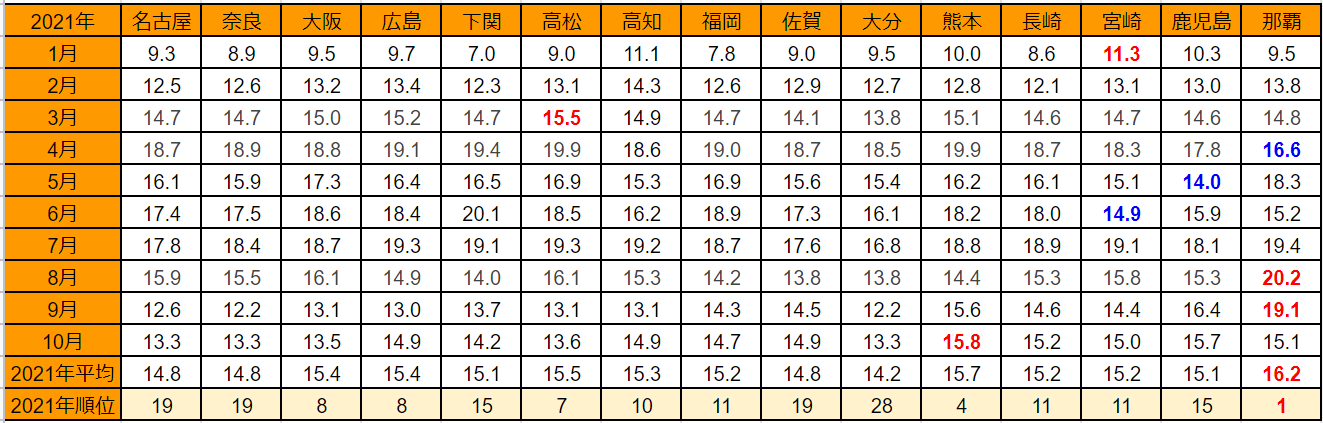 1月~10月の平均は、那覇が前月迄に続いてトップに立ち、甲府は2位にダウンしました。長野が3位に上がり銚子は4位に下がりました。