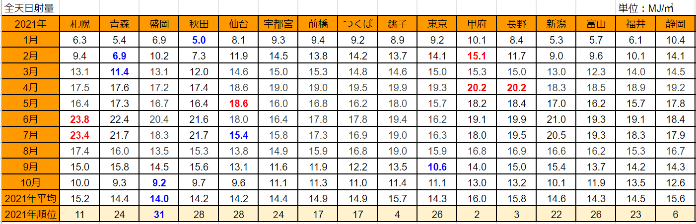 注:気象庁のHPには主要な気象観測所のみ日射量が掲載されています。県庁所在地の気象観測所でも日射量が掲載されていないところもあります。地域性を考慮して日射量が掲載されている31箇所のデータをまとめました。