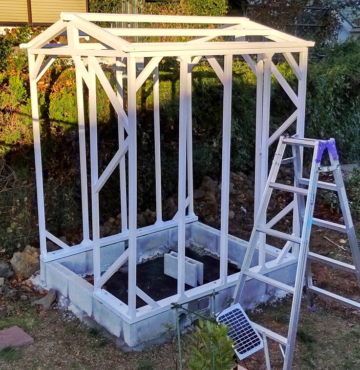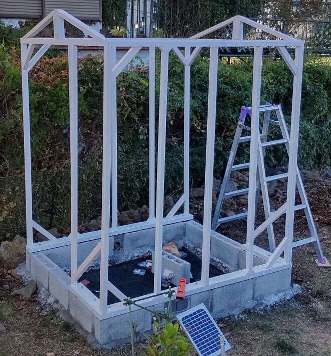前回11/6はブロック基礎の上に白いペンキを塗った木材(赤松)で温室の骨組みを組んでいる途中でした。↓