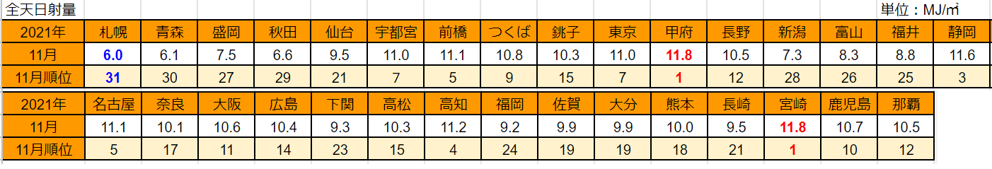 では、全国各地の11月の日射量はどうだったでしょうか?