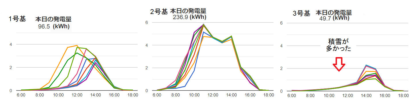 今日の発電量を確認すると、やはり積雪が多かった3号基が一番少なくなっています。(^_^;)