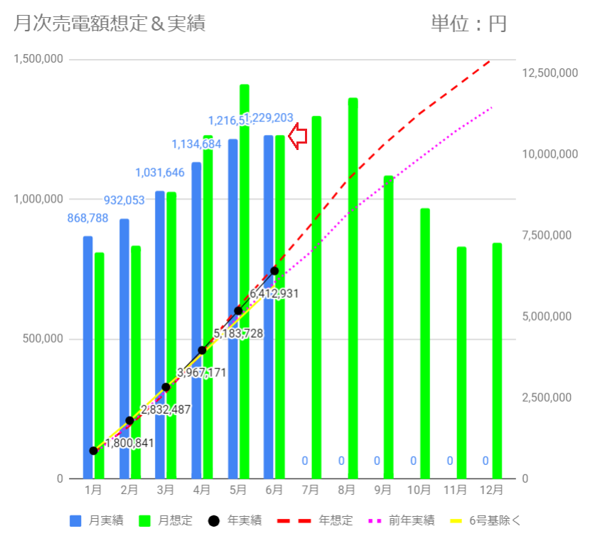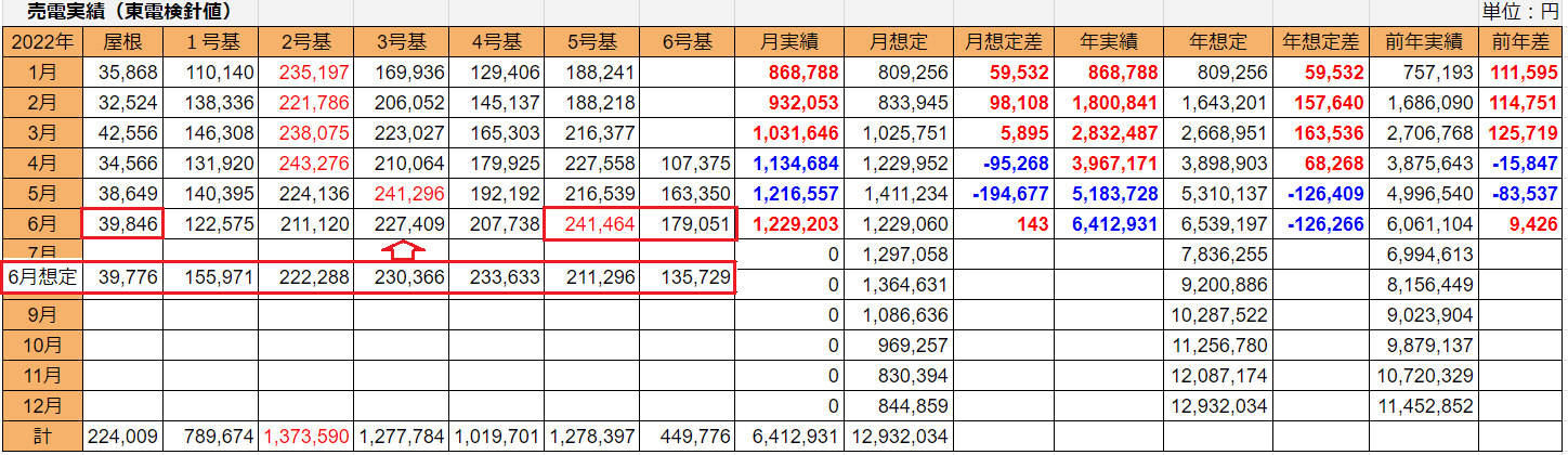 屋根、5号基、6号基が想定をオーバーし6月度の売電額は 1,229,203円 でした。