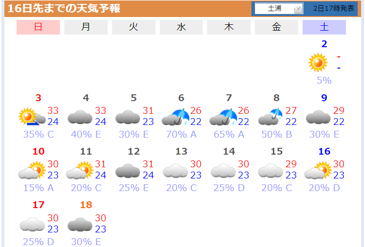 今月も好天が続いて欲しい(雨が降るなら夜間に)と思いますが、7/4(月)以降はお日様マークがかなり減っています・・・