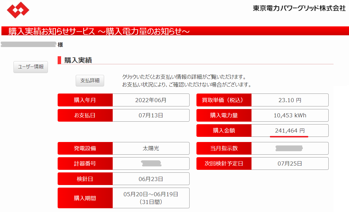 東電の検針は地区によって検針日が異なり、5月中から6月中が6月度の対象期間↓になるためモニタで測定した月発電量とはかなり相違します。