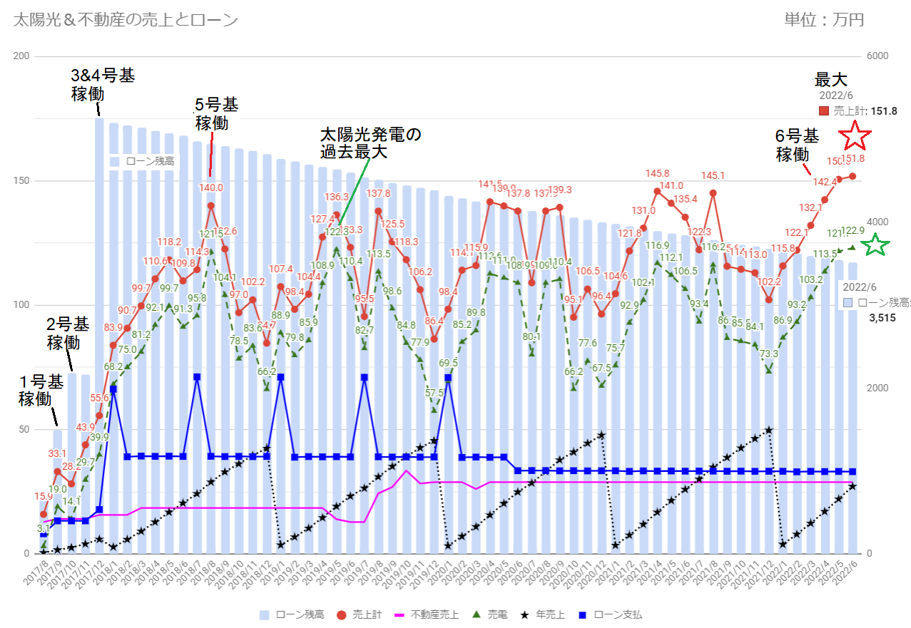 太陽光発電と不動産の合計売上は、151.8万円で2ケ月連続で過去最大を更新しました。(^^♪