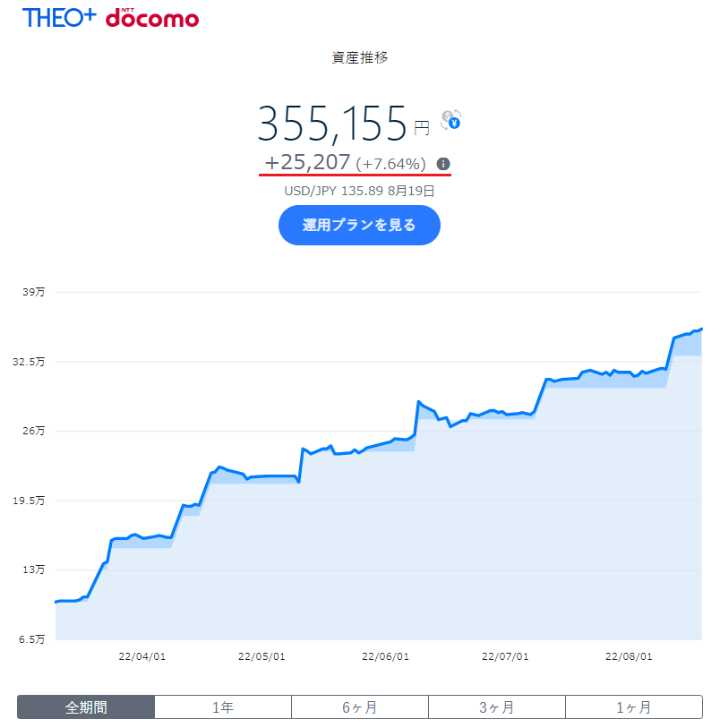 評価損益はWealthNavi > THEO ですが、WealthNaviにはTEHOに投資を始めた3月以前の評価益が含まれていますので、ほぼ同額にしてスタートした評価額で比べると、THEO=355,155円 WealthNavi=347,500円 でTHEOが僅かに優勢です。