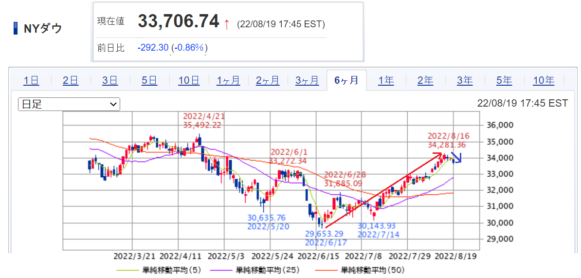 NYダウは6/17安値から8/16高値まで約2ケ月で+4,628ドル(+15.6%)も上昇した後、8/17に-171.69ドル、8/19にも-292.30ドル値下がり、しばらく調整(値下がり)が続きそうです。
