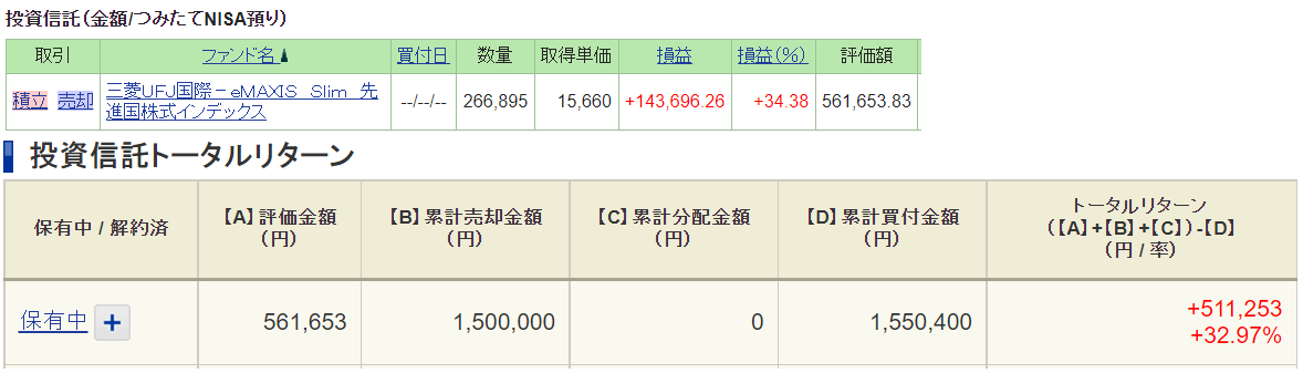 次は、eMAXIS Slim(先進国株式インデックス)です。こちらは奥さんのつみたてNISA口座で週7,600円積立しています。