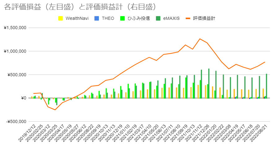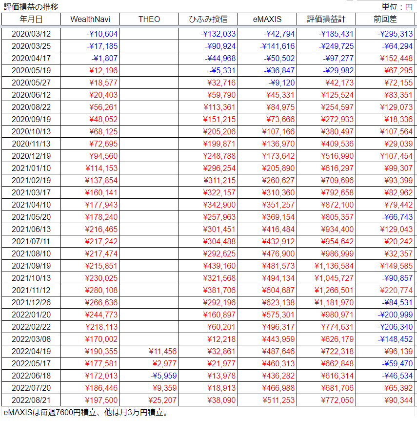 今日8/21は、ロボアドの THEO と WealthNavi 、それと投信の eMAXIS Slim /先進国株式インデックス と ひふみ投信 の状況をチェックします。