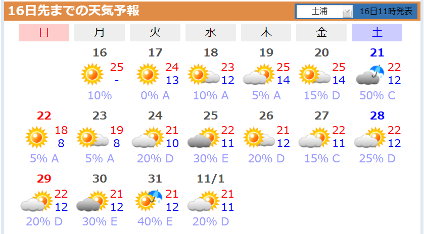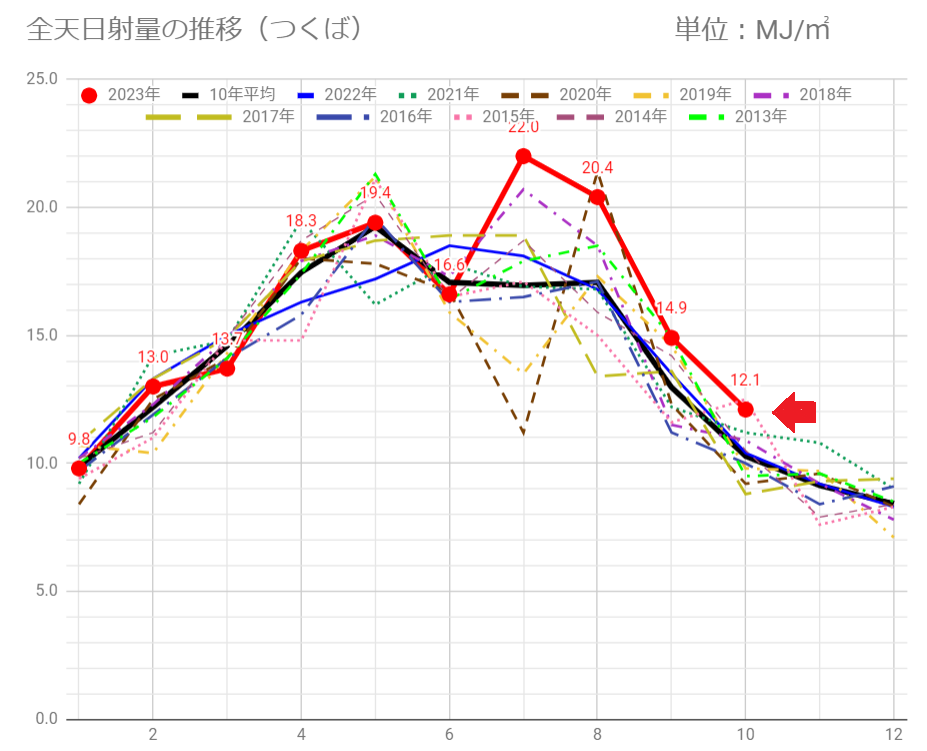 昨日10/15迄の つくば の日射量は 12.1MJ/㎡ で9月の 14.9MJ/㎡ からはダウンしたものの過去10年では2015年9月の12.5MJ/㎡に次ぐ2番目の値です。