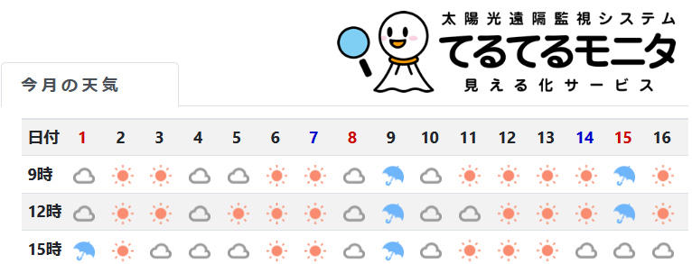 土浦近隣の2号基に導入している てるてるモニタ の天気表示↑です。